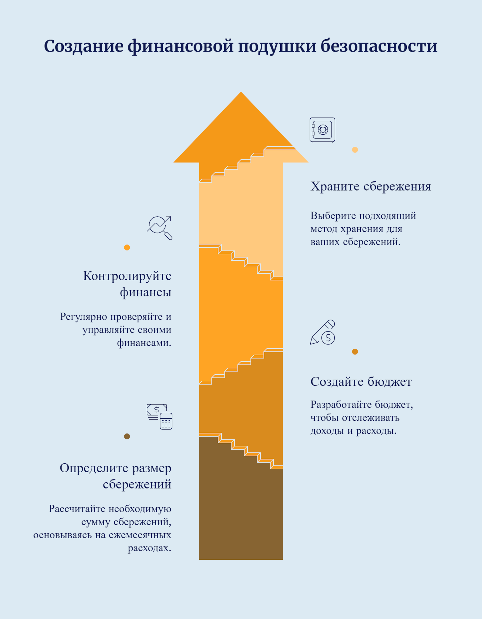 На случай непредвиденных ситуаций важно иметь резерв, равный минимум 3-6 месяцам жизни. Наш совет — регулярно откладывать часть доходов на отдельный счет и не трогать его, пока не возникнет экстренная необходимость.